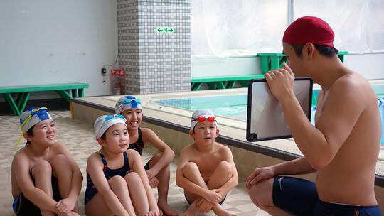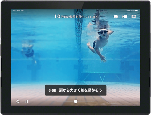 事前に配信された動画とテーマでレッスン内容を予習。当日はプールサイドで動画を使ったコーチの説明を確認したうえで実際に泳ぎ、直後に自分が泳いでいる映像を見て「できた!」を実感したり、課題に気づいたりする。