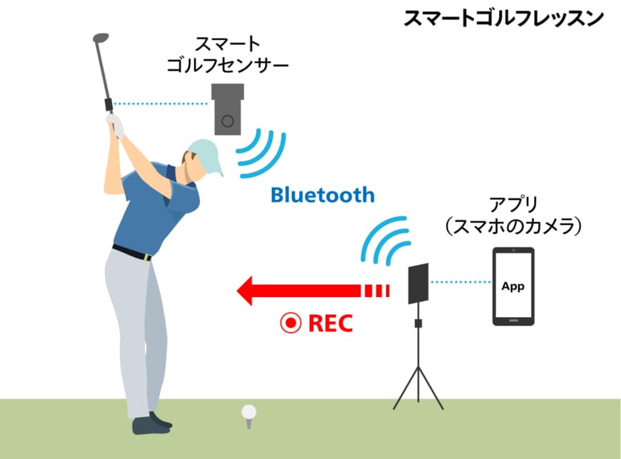 「スマートゴルフレッスンシステム」は、ゴルフクラブに装着するスマートゴルフセンサーが計測したスイングのデータに基づき、クラブがボールに当たる角度やスイング軌道、ヘッドスピードなどを分析して、スマートフォンなどで撮影したスイング動画と同期。アプリケーション上で表示し、スイングデータを可視化できる。