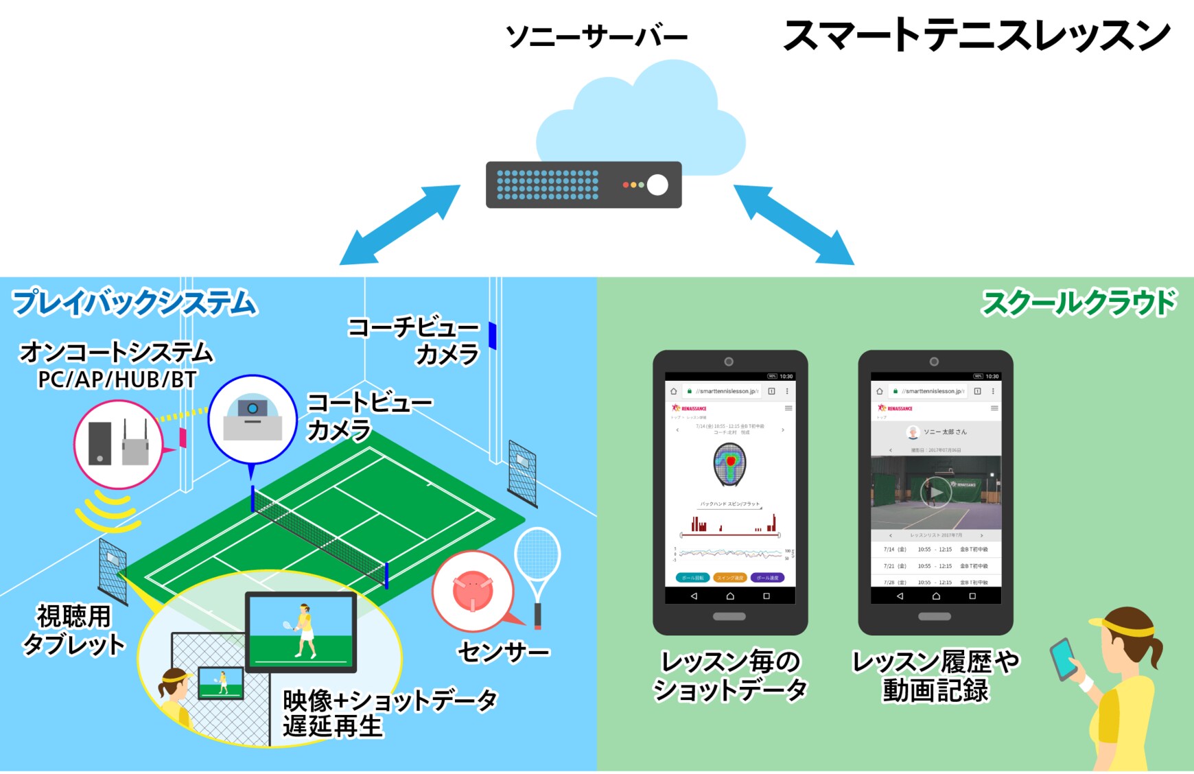 「スマートテニスレッスンシステム」は、ラケットに装着したスマートテニスセンサーで、ボールを捉えた位置やボールのスピン、ボールスピードなどショットのデータを計測。さらに、テニスコートのポスト上に設置したカメラでプレーヤーの動きを映像として記録し、その場で動画を見ながらコーチのアドバイスを受け、練習できるシステムである。記録されたデータや映像、コーチのアドバイスはレッスン後の振り返りにも活用できる。