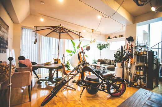 長瀬さんの自宅は、LDKの1階と、ベッドルーム、トレーニングルームがある2階に分かれたメゾネットタイプ。40畳の広さがあるリビング・ダイニングは、ソファスペースやティーテーブル、カウンターなどいくつものコーナーに分かれていて、コロナ以前はたくさんの仲間が来てサロンのように過ごしていたのだとか。