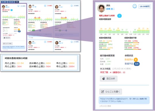 時間外勤務の推移や予測、休暇取得状況、タスク状況などからメンバーの負荷状況を共有する