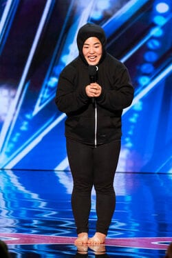 角刈りのかつらをかぶり、星条旗模様の際どい水着を身に着けて奇妙な動きのダンスを披露した。不合格という結果に終わったものの、その前後には流暢な英語でジョークを飛ばし、会場を沸かせていた。