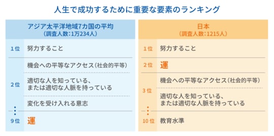 そして、もう1つ興味深いのは日本では「人生で成功するために重要な要素」として、回答数1位の「努力すること」に次いで、2位が「運」だったことだ。ちなみに、日本以外の国を平均すると、「社会的平等」や「適切な人脈を持っている」などの回答が上位で、「運」は9位であることから、意識の違いが顕著だ。