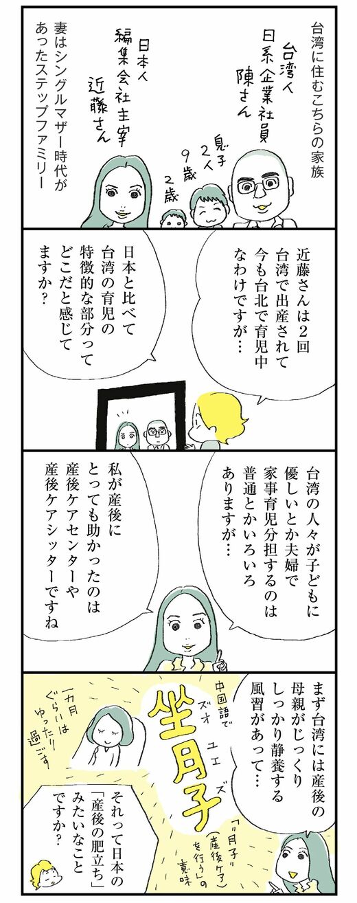 数回に分けて台湾・台北に住むある家族の話を紹介していますが、第1回は「離婚してシングルマザーになって台湾に渡った経緯」(記事はこちら)、第2回は「シングルマザーを襲う呪いの言葉」(記事はこちら)、第3回は「再婚までの経緯」(記事はこちら)、そして今回は「台湾の産後ケア(月子)」を紹介したいと思います。