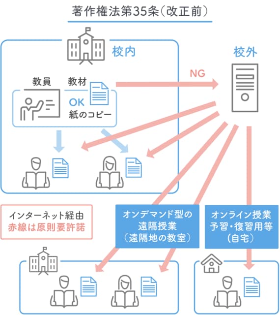 1つひとつ許諾を申請していたのでは、著作物の利用者側も著作権者側もパンクしてしまい、国が目指すICTを活用した教育は普及しない。そんな不都合に対処するため、オンライン授業でも無許諾で著作物を利用できるようにしたのが、「改正著作権法第35条」なのだ。これにより、原則要許諾だった下図の赤線部分の行為がすべて許諾不要となった。