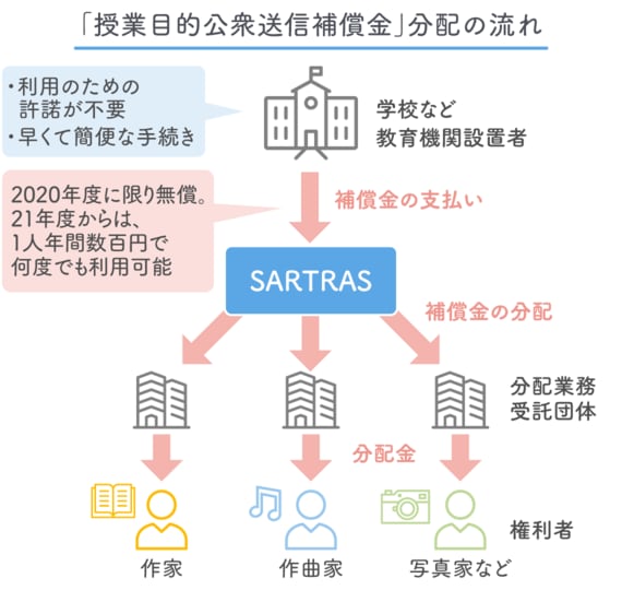しかし、補償金を支払うのは、学校や教員ではない。教育委員会や学校法人といった「学校など教育機関の設置者」だ。補償金は野方氏が理事・事務局長を務める「SARTRAS」がいったん受け取り、日本音楽著作権協会や日本文藝家協会といったこれまで著作権者への分配実績のある著作権管理団体などに分配され、そこから作家や作曲家、写真家など個々の著作権者に支払われる仕組みとなる予定だ。ちなみに「SARTRAS」は、文化庁が認可した指定管理団体で、19年1月に設立された。補償金制度の下で行われる教育における「著作物利用のワンストップ窓口」といった位置づけだ。