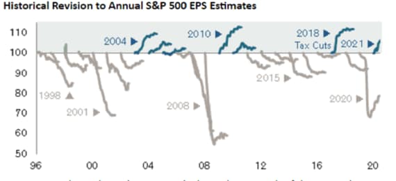 クレディ・スイスのストラテジスト、ジョナサン・ゴラブ氏によると、こうした予想さえ保守的かもしれない。過去2回の強気相場では、株価回復の初期段階で米企業の収益力を過小評価していたアナリストは、数年にわたり利益予想の引き上げを余儀なくされたという。