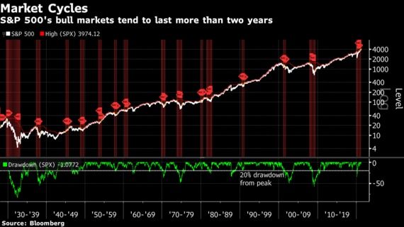 新型コロナウイルスのパンデミック(世界的大流行)で金融政策と経済は未知の領域に踏み込んでいるため、過去の事例は参考にならないかもしれない。それでも、サビタ・スブラマニアン氏率いるバンク・オブ・アメリカ(BofA)のストラテジストの分析によれば、投資家は強気相場の長さにかかわらず、株式を保有していた方が賢明だ。同氏らは相場がピークをつけた前後1年間のS&P500種のパフォーマンスを比較。3分の2を超えるケースで、最高値までの上昇分がその後の下落分を十分に相殺していたという。