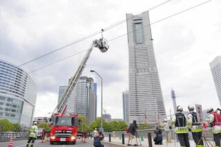 緊迫した空気が漂う現場では、消防隊員が無駄のない動きで作業を進めた。隊員と技術的な助言をする泉陽興業の社員が、バスケットに乗り込む。はしごを伸ばし、ゴンドラと同じ高さまで接近した。バスケットはゴンドラとの間を2往復。乗客役を乗り移らせて地上に降ろした。