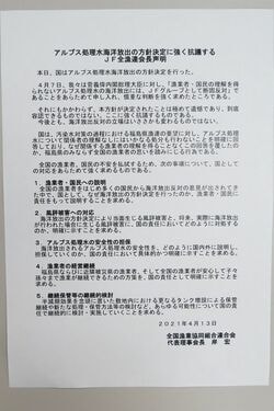 経済産業省および東電は2015年8月、ALPS処理水について、「関係者の理解なしにいかなる処分も行わない」と福島県漁業協同組合連合会に書面で回答している。今回の方針決定は、そうした約束を反故にするものに等しい。