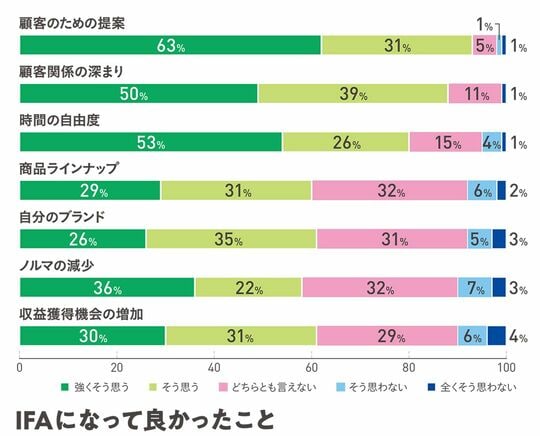 「IFAになって良かったこと」の設問に関しては、「顧客のための提案ができる」という回答が94%、「顧客関係が深まった」という回答が89%であった。加えて、「商品ラインナップ」にメリットを感じている人は過半数の60%だ。さらに、一般的にはネガティブに捉えられがちな「大手看板がない」リスクも、「自分のブランド」へシフトできるメリットとして考える人が61%に上り、意外な結果となった。アンケート調査結果と、自分が今、持っているスキルを勘案したうえで、次世代金融サービスの新しい形としてのIFAの選択肢も出てくるのではないだろうか。