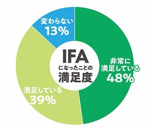 前職は約半数が大手証券会社であり、その他も含めると約7割が証券会社出身者で占められている。また、IFAとして転職をした方の満足度調査をしてみると、87%の方が転職に満足をしており、「後悔している」という回答はゼロであった。