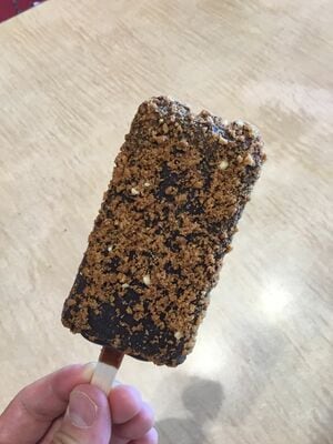 「ブラックモンブラン」は同社の看板商品の棒アイス。バニラアイスの表面にチョコレートをコーティングし、さらにクッキークランチをまぶしたものだ。ハーゲンダッツの商品などと異なり、濃厚でなくあっさりしたバニラアイスの食感が特徴。値段は税込みで119円だ。