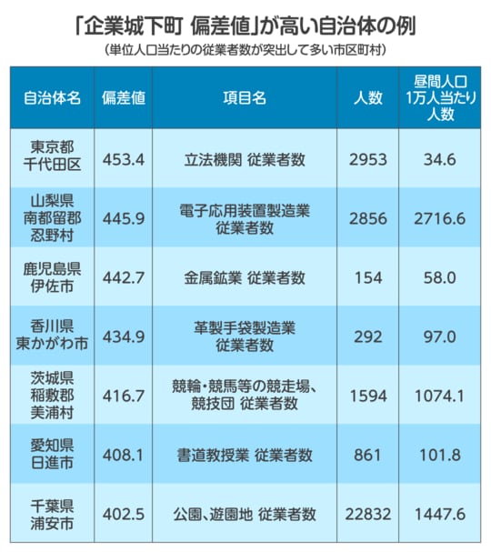 「偏差値」の手法を用いることで、統計データには表示されない意外な事実が浮き彫りになる。例として挙げるのが、いわゆる「企業城下町」の偏差値だ(下表参照)。
