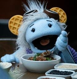 「セサミストリート」の“クッキーモンスター”も実際のクッキーをパクつき、食い散らかしますが、ワッフルの場合、口に入れることができるだけでなく、噛み、飲み込むといった人間が食べ物を食べるときの一連の動作ができます。口の部分が特別にカスタマイズされているのです。だから、ワッフルの口にピザや小籠包、おにぎりなどが運ばれるたびに、平らげているかのように見えるのです。ソースを指で拭って、口に入れる場面まであります。さすがにそのとき、ワッフルの指は汚れたままになっていますが、食の体験が強烈に伝わってきます。