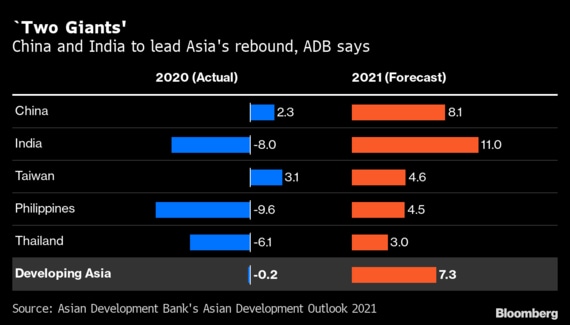 浅川総裁は、域内のワクチン接種遅延と感染再拡大の継続的脅威が「非常に多くの下振れリスク」の最上位に来ると指摘。ADBは今週、今年の新興アジア経済成長率見通しを7.3%に上方修正した。前年水準が低かったことに加え、中国とインドという「2つの大国」が景気回復を主導するだろうと総裁は話した。