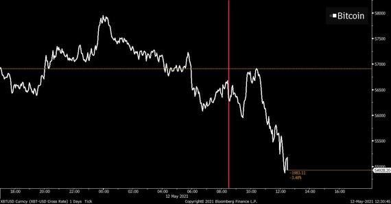 しかし12日、4月の米消費者物価指数(CPI)が2009年以来の高い伸びを示した後、ビットコインは下落した。下のチャートで、赤い縦線がCPI発表の時点を示す。