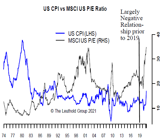 一方、ロイトホルト・グループは、米消費者物価指数(CPI)とMSCI米国指数の株価収益率(PER)の過去の関係に基づき、異なった結論に達している。