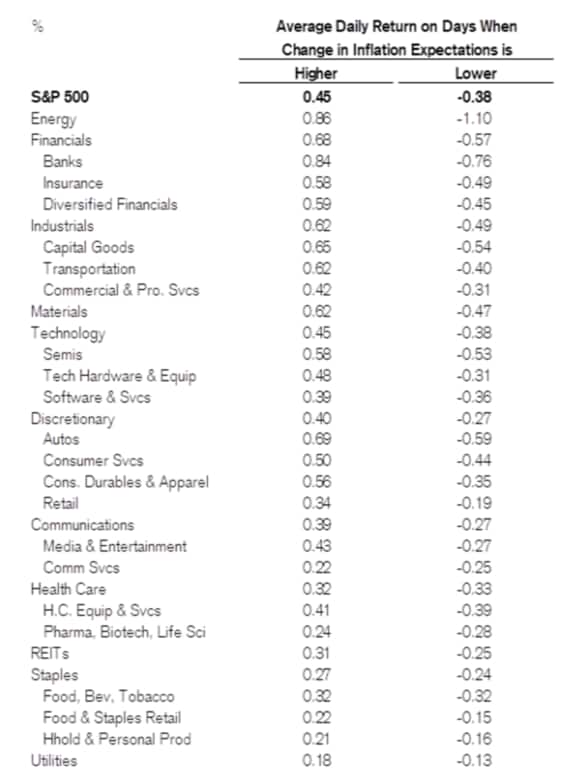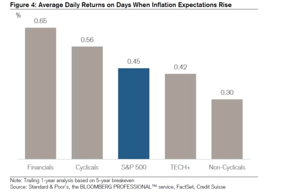 クレディ・スイスによると、S&P500種株価指数の全てのセクターが平均すると、インフレ懸念が高まった日にはリターンがプラスになった。最大の恩恵を受けてきたのがエネルギーと金融株で、生活必需品と公益セクターは最もリターンが小さかった。