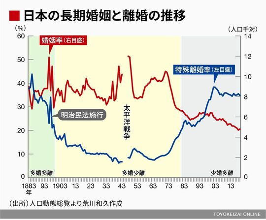 現代と大きく異なる点は、明治時代は離婚も多い代わりに結婚も多かった「多婚多離」だったことです。離婚も多いがそれ以上に結婚も多かった。それが少子化の現代との差につながっています。