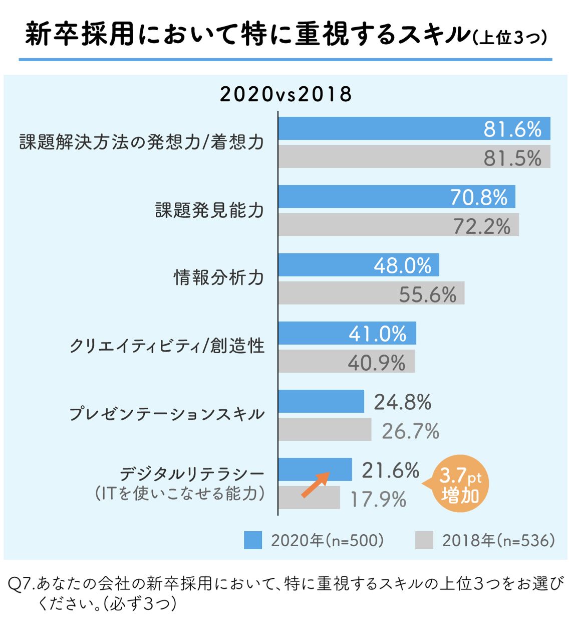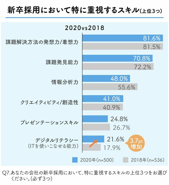アドビが、企業の新卒採用担当500人を対象に行った調査によると、新卒採用において重要度が上がったと思うスキルとして、デジタルリテラシー(ITを使いこなせる能力)が前回(2018年)調査比で6.6ポイント増の31.2%に上昇した。