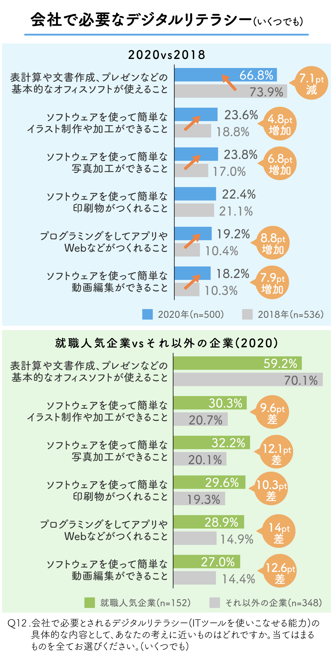 企業は、基本的なオフィスソフトが使えるだけにとどまらず、クリエイティブ系ツールを使いこなすスキルを持つ人材へのニーズを高めているのだ。しかも、このクリエイティブ系デジタルリテラシー重視の傾向は、就職人気ランキングに登場する企業で、より鮮明になっている。