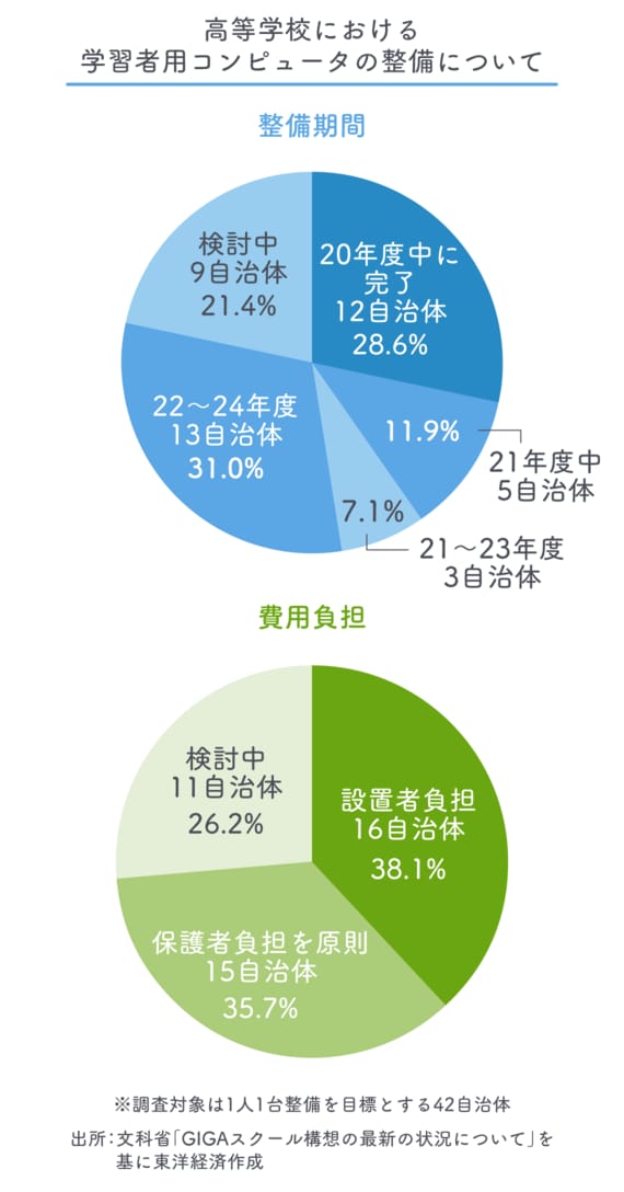 では「1人1台」を整備する費用は誰(どこ)が負担するのか。GIGAスクール構想では、小中学校への端末配備の費用を国が全額負担するが、高校への端末配備については、国の負担は部分的な補助となっている。調査によれば整備を目標としている42自治体のうち、16自治体(38.1%)は自治体自身の負担で整備する「設置者負担」としている。