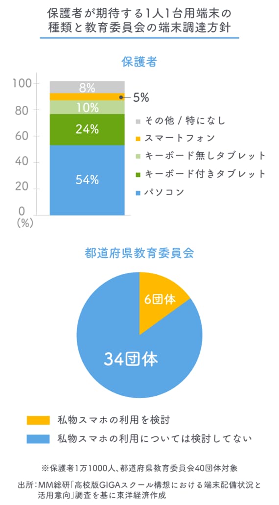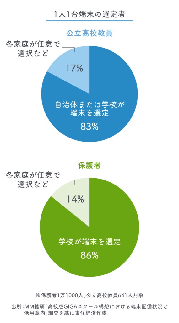 端末の選定は、教員の83%が「自治体または学校が選定に関与すべき」、保護者の86%が「学校が関与すべき」と回答している。教員からは「端末の選定は学校や自治体に任せてほしい。端末は手段であって目的ではない」(数学教員)、「スマートフォンでは授業は困難」(理科教員)という意見があったという。また、保護者からは「教科書と同じ考え。教材になるので統一したほうがいい」「自分たちではどの端末がいいか判断しかねる」という意見が寄せられたとある。