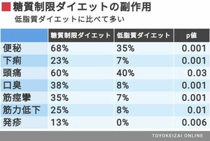 糖質制限ダイエットは、低脂質ダイエットと比べて副作用も多い食事法です。やはり不溶性の食物繊維の摂取量が減るので、約7割の人が便秘になりますし、6割の人が頭痛を経験すると報告されています。
