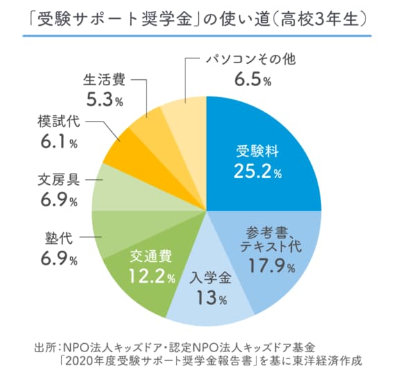 気になる奨学金の使い道は、受験料が4分の1の25%、参考書、テキスト代18%、入学金13%、交通費12%となっている。決して十分とはいえないであろう現金給付ではあるが、大きな価値を持つことが実感させられる内容だ。