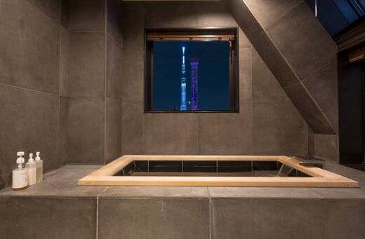 Room1001で注目はベッド! 海外から取り寄せたスペシャルな仕様で、フカフカ感に包まれて、寝心地がバツグン! 一度横になれば、その違いに気づくはず。ちなみに、お値段1000万円だとか。そしてバスルームには、ネオンきらめくスカイツリーや浅草寺を望むビューバスが! ちなみに、18時以降の遅めのチェックインならば、グッとリーズナブルに滞在できます。