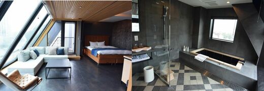 おすすめのお部屋は、10階にある「スイート・キング・ペントハウス」(Room1001)。傾斜したフルハイトの窓は浅草の街とシームレスにつながったよう。広さも50平方メートルあるので、開放的です。