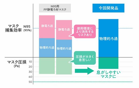 「通常のN95マスクは静電気の力も使って粒子を捕集するのですが、湿度が高いと静電気が生じにくくなり、捕集効率が下がります。そのため今回は、物理的にろ過する方法を採用。捕集効率約99%を達成しつつ、長期保存にも耐えうる製品が実現しました。さらにアルコールなどの消毒剤で除染することで、繰り返し使うことができます。