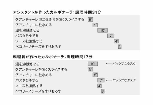 キッチンの作業でも同じことが言えます。この場合、パッシブなタスクから手をつけずに調理すると、仕上がるまでに倍の時間がかかってしまうのです。