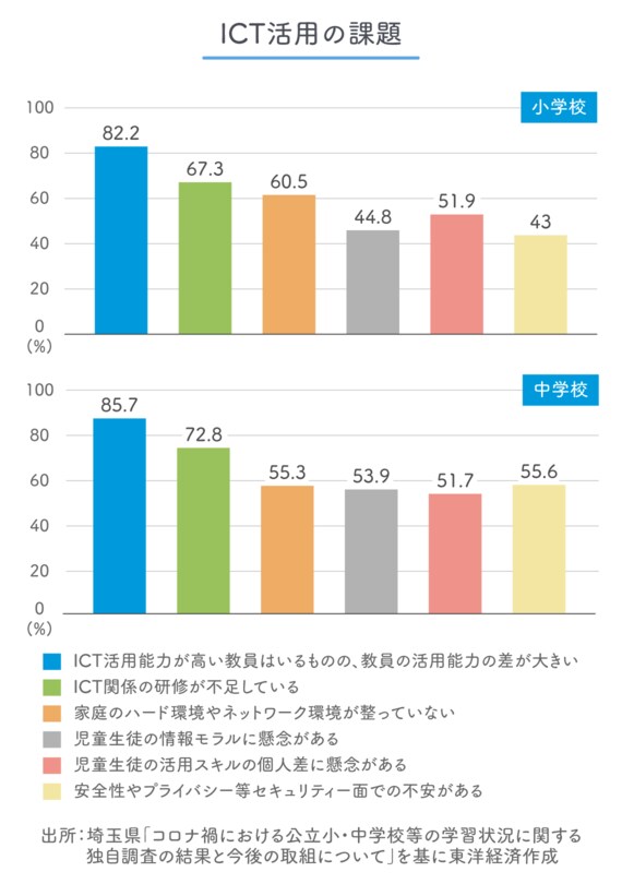 一方、ICT活用の課題については、小・中学校の両方で「ICT活用能力が高い教員はいるものの、教員の活用能力の差が大きい」と回答した学校が80%以上で最も多かった。2番目に多かったのは「ICTの研修が不足している」という学校で小・中学校ともに70%前後あり、「家庭のハード環境やネットワーク環境が整っていない」という学校も60%前後に達している。また、今後実施を希望するICT研修については、小・中学校ともに「各教科等におけるICT活用に関する研修」と回答した学校が90%以上に及び、「端末やソフトウェアの使い方に関する研修」と回答した学校も小・中学校で85%以上だった。