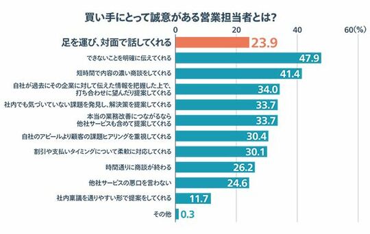 では、買い手は営業担当者のどこに誠意を感じるのか。上位を占めたのは、「できないことを明確に伝えてくれる」(47.9%)、「短時間で内容の濃い商談をしてくれる」(41.4%)だった。