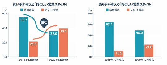 では顧客の意識は、具体的にどう変化したのか。今回の調査では、顧客にとっての「好ましい営業スタイル」についての質問で、顧客側に対し「2019年12月時点での意識」と「2020年12月時点での意識」を聞いた。19年12月時点での気持ちとして「訪問型営業が好ましい」と回答した人は53.7%、「リモート営業が好ましい」と回答した人は21.0%だったが、2020年12月時点では、「訪問型営業が好ましい」は35.0%へと大きく低下。それに対して「リモート営業が好ましい」は38.5%に伸びた。