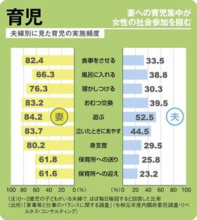 しかし、現状は厳しい。育児の実施頻度を見ると、子どもに「食事をさせる」のは、妻が82・4%の一方、夫は33・5%。「保育所へ送る」のでも、妻は61・8%に対し、夫は25・8%だ。「おむつ交換」になると、妻が83・2%、夫は39・5%だった。それだけ妻の“ワンオペ育児”は日常化している。「フルタイムで働く子持ち女性が、何を犠牲にしているかというと、自分の時間資源だ」と社会学者の上野千鶴子氏は説く。