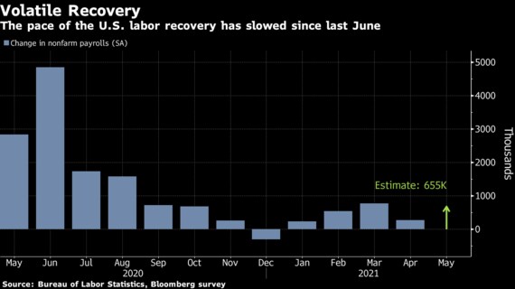 ブルームバーグの調査によると、5 月の米雇用者数増加幅の予想レンジは33万5000人から100万人と広い。全ての市場予想を下回った前回の結果を受け、4日の統計発表に先立ち、予測モデルを微調整したエコノミストもいる。
