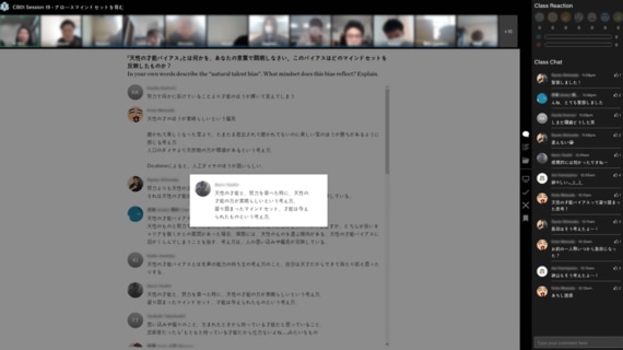 「ミネルバ・フォーラム」では、授業中の学生の発言量が色で可視化されていて、まるで最前列で授業を聞いているかのような臨場感がある。しかも、授業内のアウトプットが成績に直結するために学生は事前準備も含めて気が抜けない。一方、先生は授業ではファシリテーター役だが、録画を基に毎回学生にフィードバックを行う。どんなフィードバックが効果的かはデータを取っているから、学生がスキルを効率的に身に付けられるのはもちろん、理解度を見て先生が授業を改善することも容易だ。