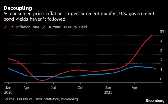 10日発表された5月の米消費者物価指数(CPI)は前年同月比5%上昇と、2008年以来の大きな伸びを記録したが、指標の米10年国債利回りは同日に1.43%と、3カ月ぶりの低水準を付けた。11日は1.45%。