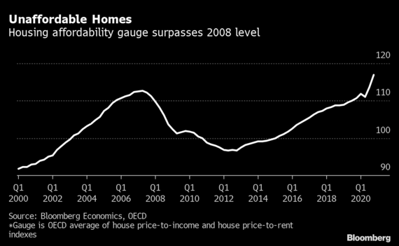BEのエコノミスト、ニラージ・シャー氏はリポートで、「幾つかの要因が世界各地で住宅価格をかつてない水準に押し上げている。記録的な低金利や前例のない財政出動、頭金に充当できる行動制限に伴う貯蓄、限定的な住宅在庫、世界経済の堅調な回復への期待が全て寄与している」と指摘した。
