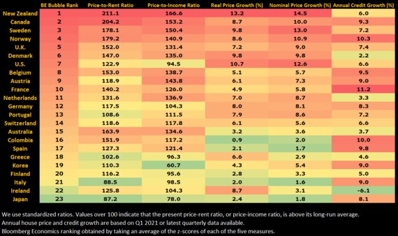 BEの指標に基づけば、ニュージーランドとカナダ、スウェーデンが最も過熱気味の市場にランクされ、英国と米国も最上位に近いリスク水準となった。