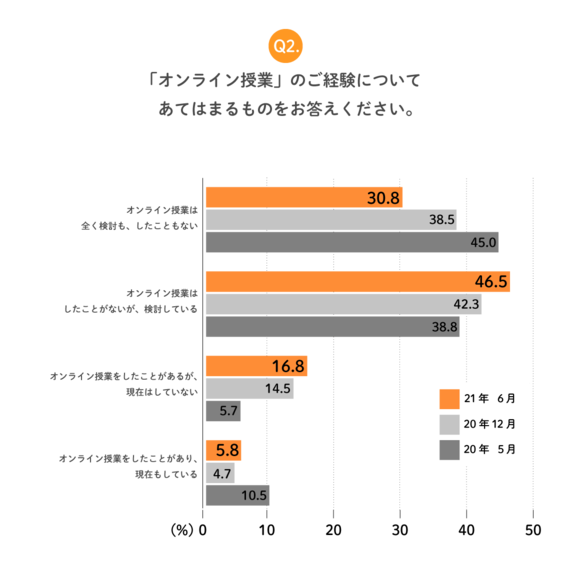 ただし、そのIT環境をどのように授業に生かしていくか、その点ではまだまだ模索が続いているようだ。オンライン授業の経験を聞く質問では、「オンライン授業をしたことがあり、現在もしている」との回答はわずか5.8%。「オンライン授業をしたことがあるが、現在はしていない」が16.8%。昨年12月と比較をしても、オンライン授業の実施状況に大きな変動はなく微増の状況だ。