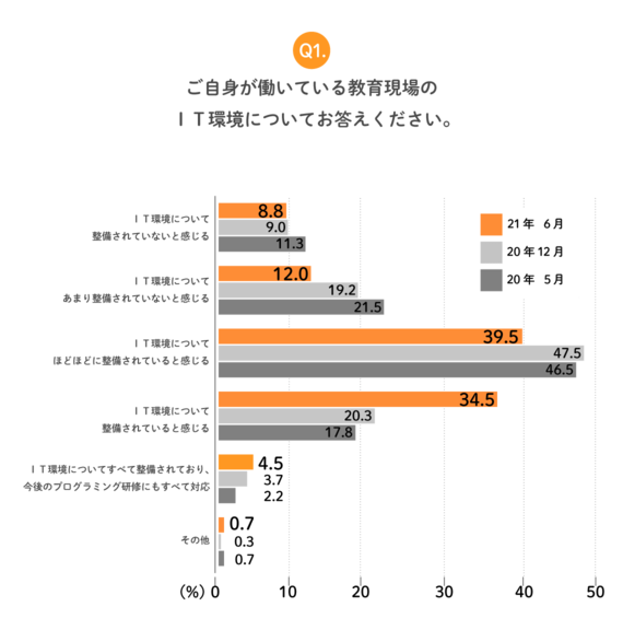 GIGAスクール構想では、公立の小・中学校への2020年度中の「1人1台端末」の配布を目指してきただけに、IT環境は急速に整えられたはずだ。アンケート結果を見てもそれは如実に表れている。