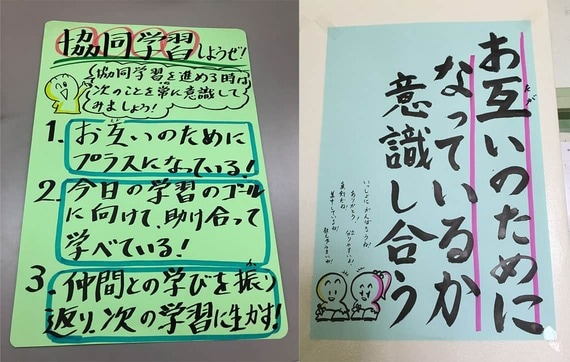 この4つができている状態が「協同学習」です。教室にはオリジナルの掲示物を貼って、授業中に「今これができているかな?」と確認や振り返りをするようにしています。