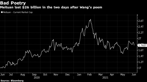 美団の最高経営責任者(CEO)を務める王氏による投稿後、同社の株価は急落。同氏はその後、業界内の先見性のなさを指摘するための引用だったと説明したが、アリババグループ創業者の馬雲(ジャック・マー)氏による昨年の政府批判を連想した投資家もいた。