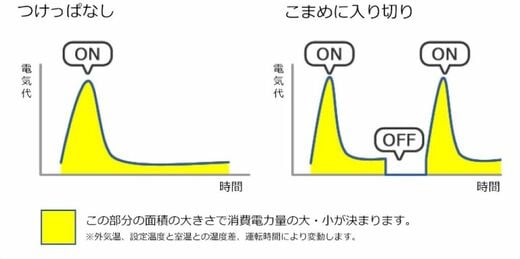 余談ですが、筆者も在宅時やタイマー使用からつけっぱなしに変えてみたところ、ビビるほど電気代が安くなった(※注:個人の感想です)経験があり、それから夏はほぼつけっぱなし。温度が安定しているので寝苦しさに困ることもナッシングです。フィルター掃除は強い雨などで気温が下がったときにしています。