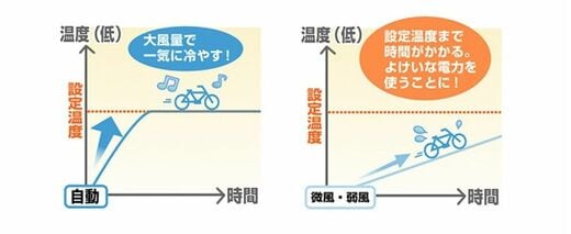 設定温度に達した後、空間の温度を維持する際に使う電力は実は『少なめ』なのです。微風や弱風だと、設定温度にするまでに時間がかかり、無駄な電気代がかかってしまうことも…。「自動」にしておくことが一番効率良い方法です!