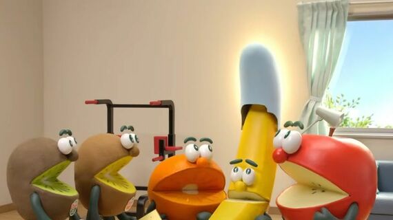 「♪ヘルシーは楽しみながらやるのがいいんだよ~」といった軽快な歌をバックに公園で踊っていたキウイブラザーズの前に“リンゴ先輩”と“ミカン先輩”が現れ、筋トレを始めるもストイックになるあまり「三日坊主」になってしまった“バナナ先輩”のもとへ彼らを連れていく。